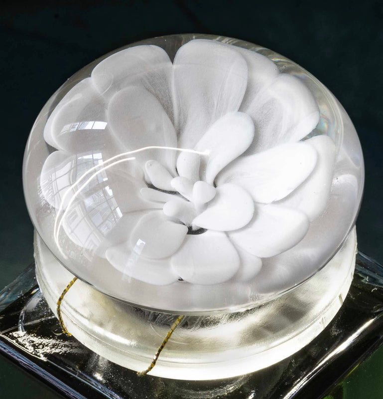 Ses œuvres sont fusionnées à l’aide d’un chalumeau et formées par le souffle pour les pièces creuses, ou uniquement par le gestuel pour les pièces massives.